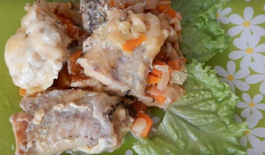 Минтай, тушеный с морковью и луком в сметане в мультиварке