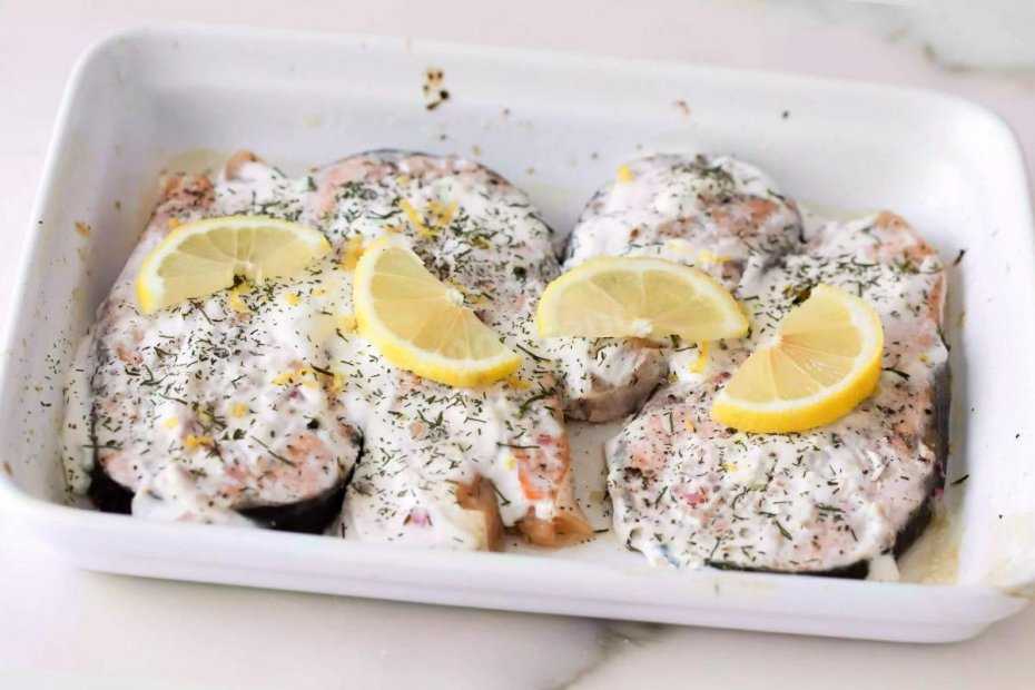 - Разделать тушку рыбы, очистить ее и нарубить на стейки, которые посолить и выложить в емкость для запекания.