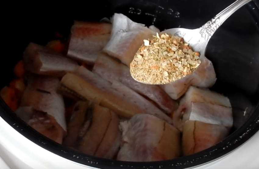 3. Минтай очистите, удалите плавники, нарежьте средними кусками. Выложите рыбу в мультиварку, посыпьте солью и специями.