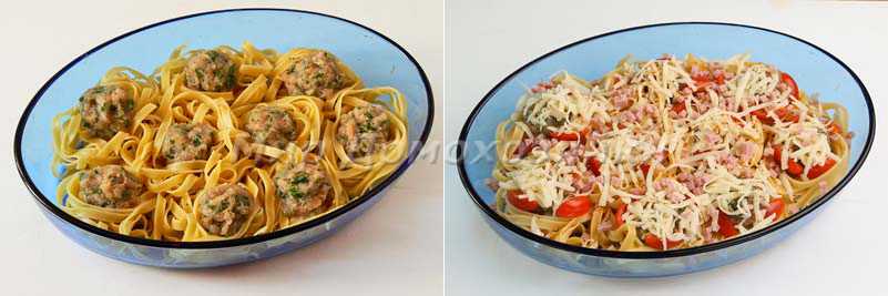 Сверху в каждое гнездо из макарон кладем по мясному шарику.