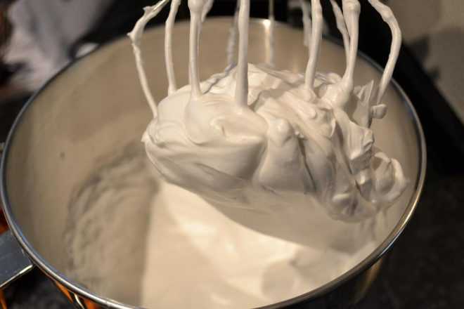 - Правильно взбитая масса из пюре с белком и сиропа с агаром. Ее нельзя взбивать очень долго, более более 13 минут, иначе она осядет и станет жидкой. В конечном итоге масса должна быть очень тугая, хорошо держать форму.