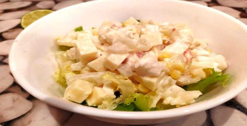 В средиземноморской кухне оригинальный салат готовится без майонеза, его нужно заправить смесью оливкового масла и сока лайма. Закуску можно приготовить за считанные минуты, поскольку пропорции выверены идеально. В лакомстве нет дорогостоящей экзотики, все продукты имеются в любом магазине.