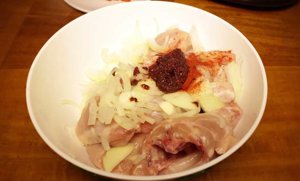 2. Порезанный лук добавим к курице. Так же добавляем паприку и аджику.