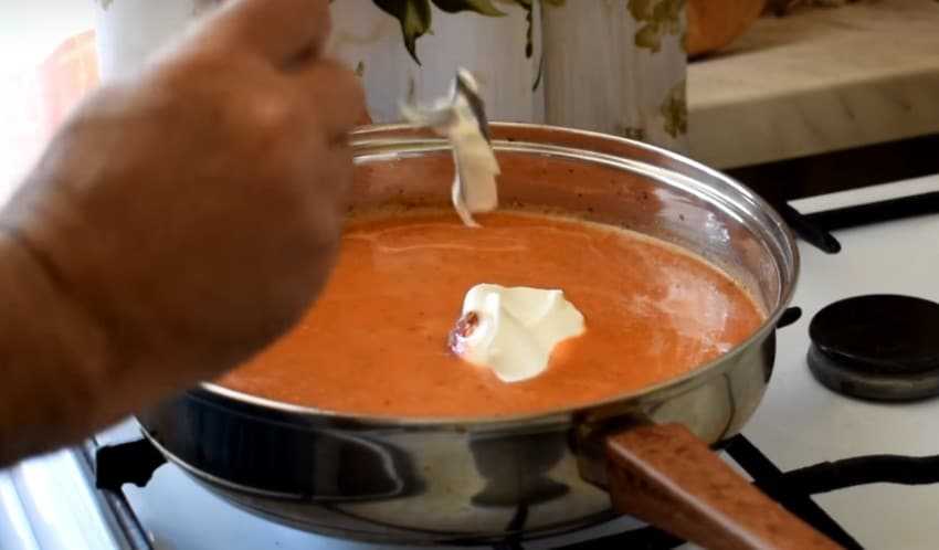 5. Следом отправляем пасту из томатов и сметану любой жирности.