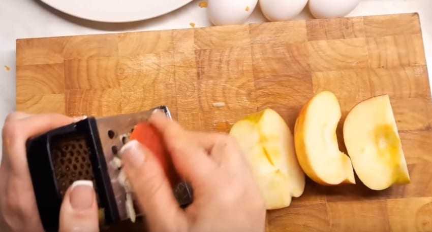 2. В отдельную посуду натрите на крупной тёрке одно яблоко (второе оставьте). Отожмите лишний сок и присыпьте корицей.