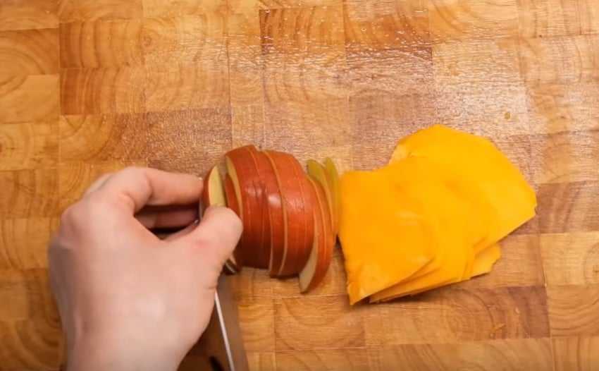 Очищенные кабачки и дыни, а также яблоки вместе со шкуркой режут длинными ломтиками и перемешивают.