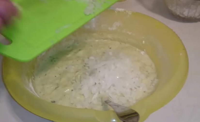 - Присоединяем сыр к общей массе. Разбиваем яйцо и всыпаем пару тройку столовых ложек муки.
