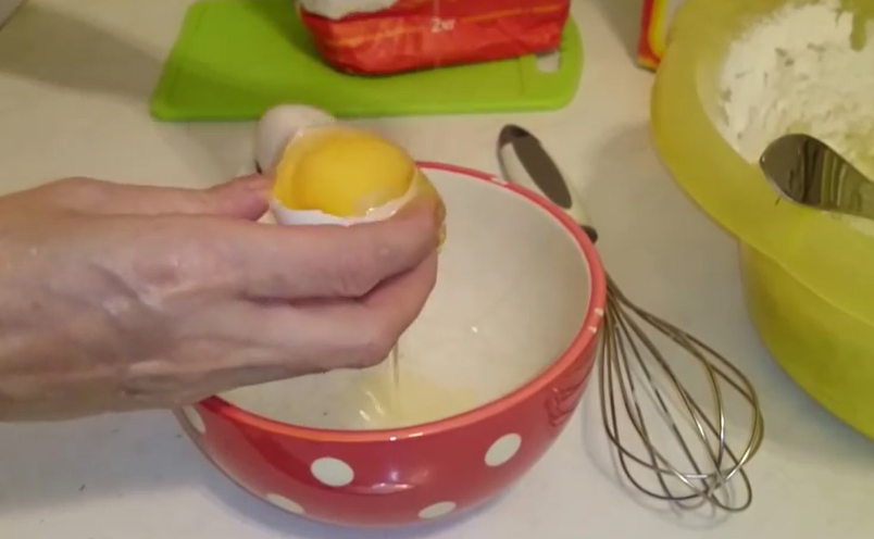 5. У яиц отделяем белки от желтков. Желтки отправляем в тесто, а белки взбиваем до пены и также добавляем в тесто. Взбитые белки еще больше поднимут оладьи.