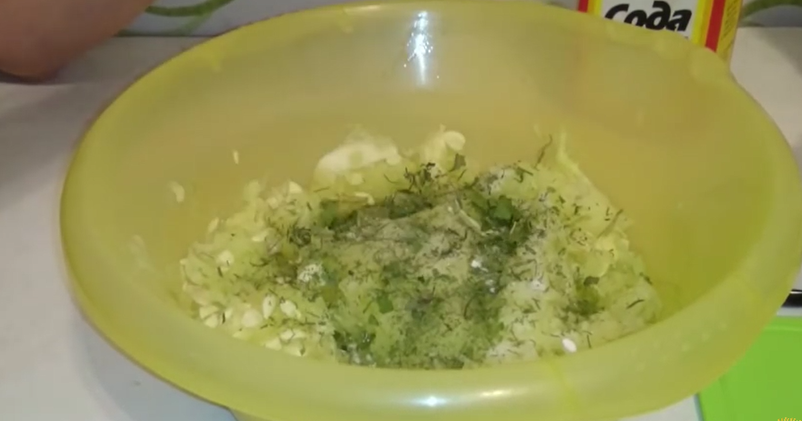 2. Свежую или сушеную зелень измельчаем и добавляем в кабачок.