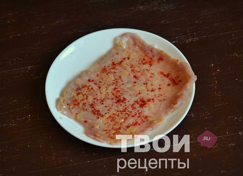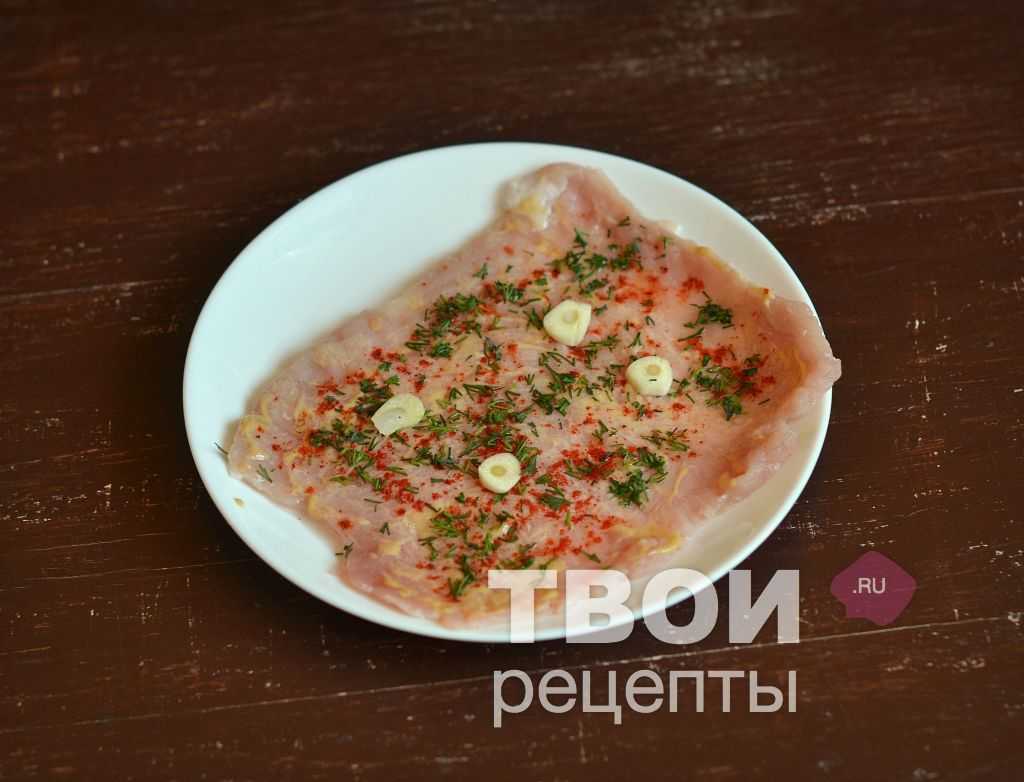 Каждый мясной кусочек отбейте молоточком. Чтобы мясо не порвалось, делайте этот шаг через пищевую пленку или пакет. С двух сторон натрите солью и измельченным перцем. Оставьте на 10-15 минут промариноваться.