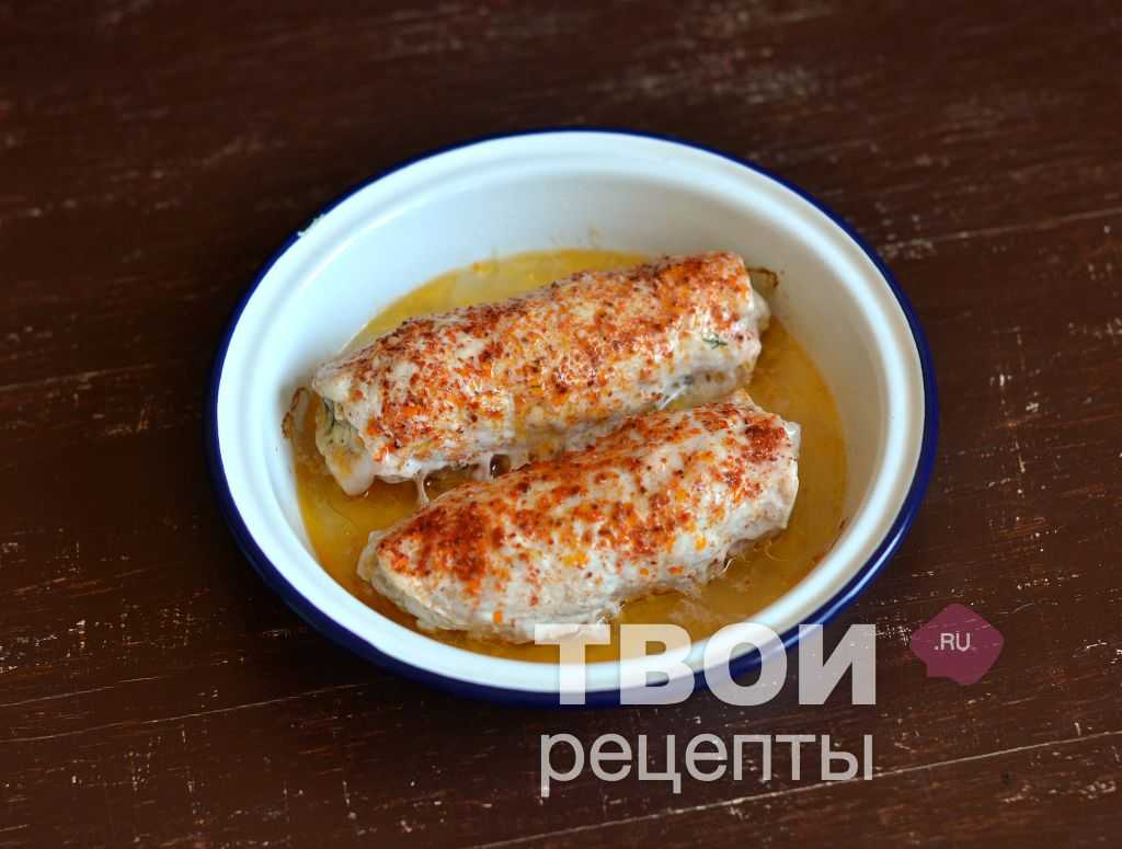 Все рулетики скрепите зубочисткой или зафиксируйте ниткой, чтобы в период выпекания они не раскрутились и отправьте в горячую духовку на 25-30 минут при температуре 180 градусов. При желании, рулетики, предварительно, можно обжарить на растительном масле до румяной корочки, а после допечь в духовке.