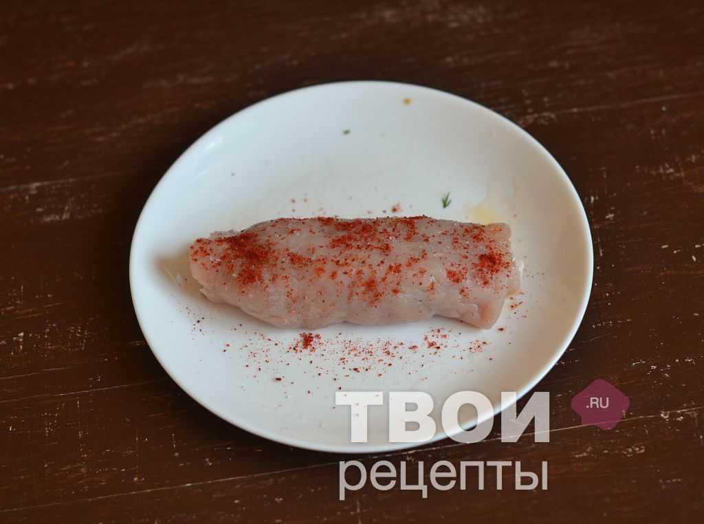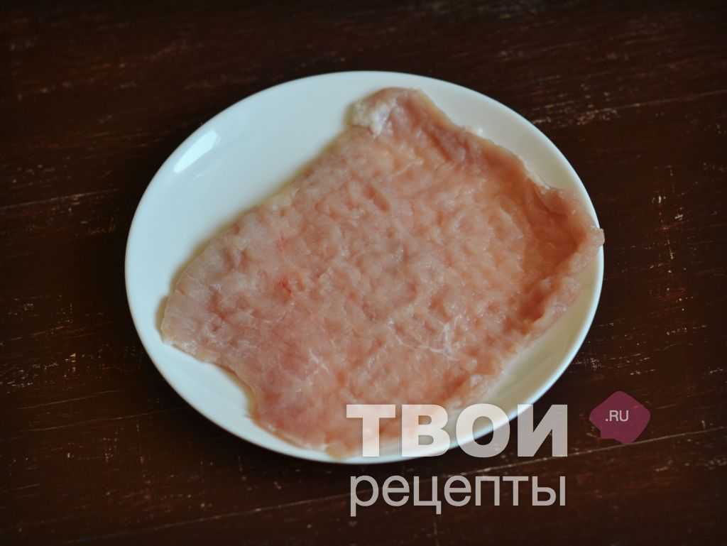 Для приготовления рулетиков покупайте мякоть либо вырезку, чтобы было удобно нарезать на пластинки. Промойте хорошо и обсушите бумажным полотенцем. Нарежьте тонкими слайсами высотой 3-4 мм.