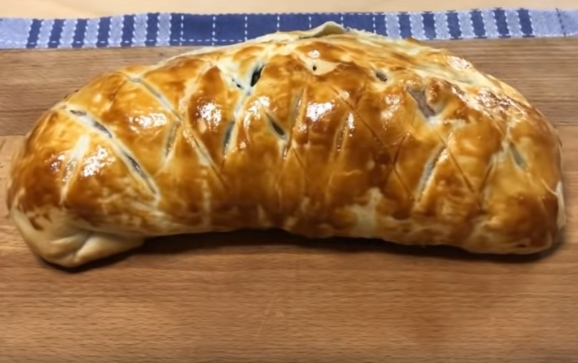 - Тесто раскатайте в тонкий пласт. Заверните в него мясо. Скрепите, чтобы мясной сок не вытек в духовке.