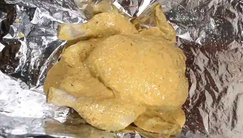 Противень накрыть листом фольги, смазанный подсолнечным маслом. Посередине положить маринованную тушку, полить сверху оставшимся маринадом. Завернуть фольгу в форме конверта, а затем еще в несколько листов фольги, чтобы сок не вытекал.