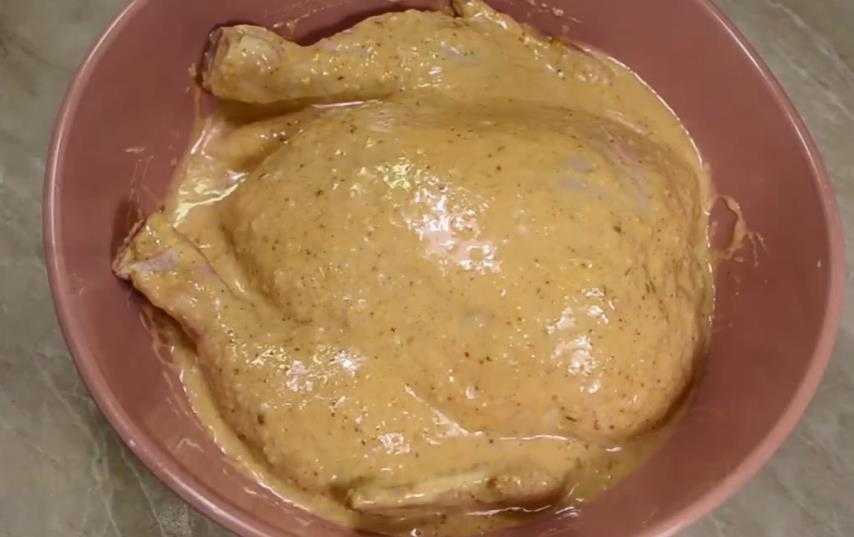 Вымытую курицу натереть смесью приправ, обмазать со всех сторон маринадом и оставить в холодном месте на 24 часа, накрыв пленкой.