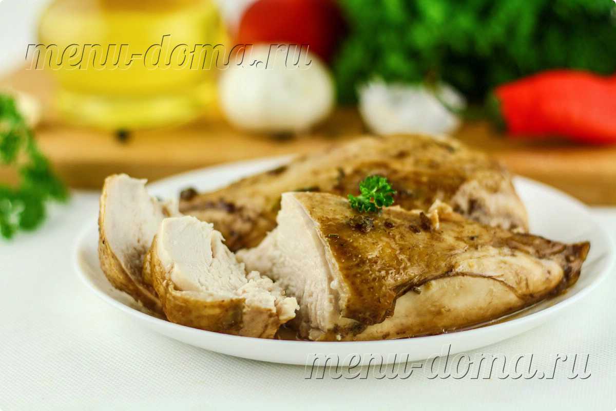 - Перед приготовлением эту часть птицы рекомендуется подержать в маринаде или в специальном рассоле. Для этого необходимо вскипятить на плите 1 л воды с солью и сахаром (по 45 г), добавив лавровый лист, душистый перец и другие специи. Куриная грудка заливается остывшим рассолом и отправляется в холодильник на 3 часа. При таком способе маринования она буквально напитывается влагой и получается сочной.