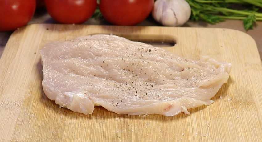 Куриное филе разрезаем вдоль на 2 пласта. Это в том случае, если филе довольно толстое. То есть из одного филе у Вас должно получиться две отбивных, которые мы будем закручивать в рулеты. И накрыв целлофановым пакетом с помощью кухонного молоточка хорошенько отбиваем, но не перестарайтесь, куриное филе очень нежное, может расползтись. Немного солим и перчим отбитое мясо по вкусу. Соли не нужно слишком много, ведь у нас будет в начинке сыр, а он достаточно солёный.