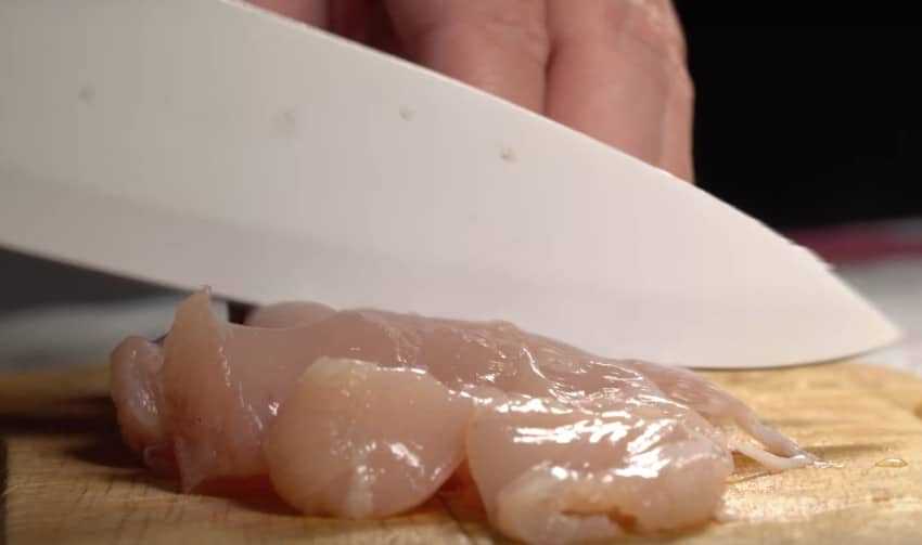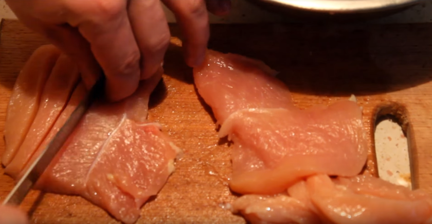 Блюдо готовится быстро, поэтому рекомендую использовать свежую, незамороженную куриную грудку. Нарезаем небольшими полосками.