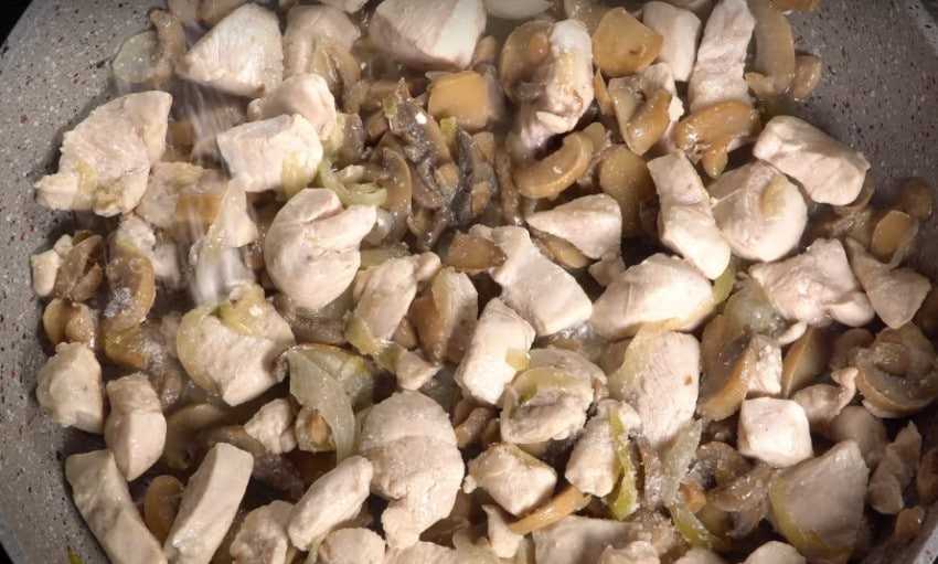 - Обжариваем все вместе около пяти минут. Филе должно слегка подрумяниться. Долго на огне его не держим, иначе белое мясо станет жестким.