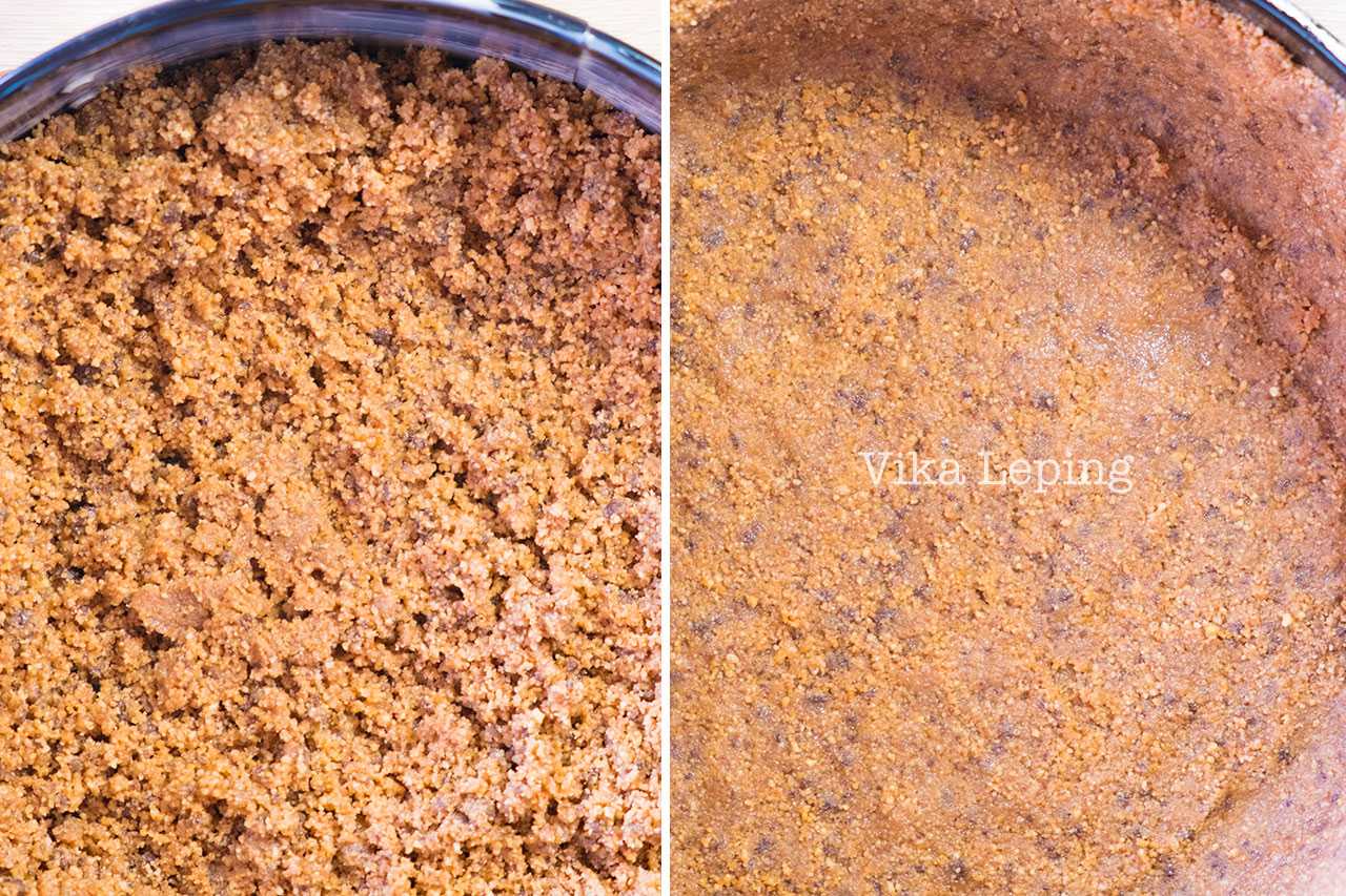 Высыпаем песочную крошку в форму и хорошенько утрамбовываем ладошками. Очень плотно! Не забываем про боковушки, намного вкуснее, когда бортики тоже хрустят. Во всяком случае, рецепт Чизкейка Нью-Йорк это подразумевает.