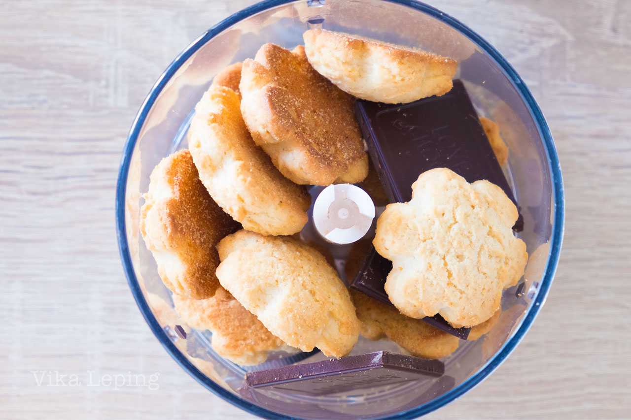 Песочное печенье и черный шоколад перемалываем в блендере. Шоколад можно и не класть — это просто вкусное дополнение. А еще его можно заменить на любимые орешки. Или просто ничего не добавлять — это на ваше усмотрение, в любом случае, рецепт классического Чизкейка добавки не подразумевает. А вот покупное песочное печенье можно заменить на домашнее. Конкретно рецепта печенья у меня нет, но есть песочная основа, она нереально вкусная, испекла и перемолола бы ее, но времени не было. А жаль, потому что во всем покупном печенье содержатся транс-жиры, а это очень и очень вредно.
