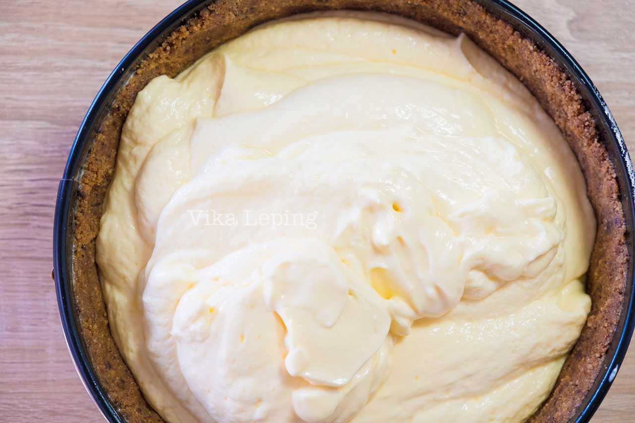 Аккуратно выливаю творожную смесь поверх коржа. Если вы знаете, что ваша форма может подпускать массу в месте соединения бортов и дна, оберните форму фольгой для подстраховки.