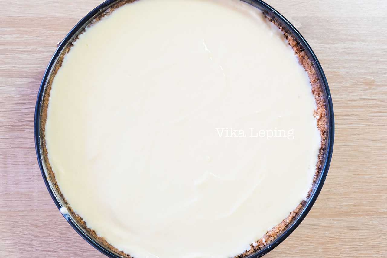 Достаем форму с основой для Чизкейка из холодильника и выливаем начинку внутрь.