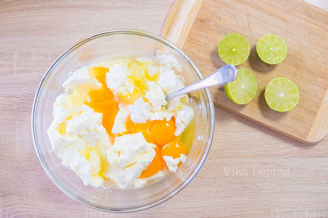 Добавляем в крем-сыр яйца, сахар или фруктозу, сок лаймов или лимонов. Я очень рекомендую использовать лайм, потому что он делает почти любое блюдо вкуснее в 100 раз. Десерты не исключение. Но изначально для готовки использовались лимоны, поэтому со спокойной душой берите их, если хотите.