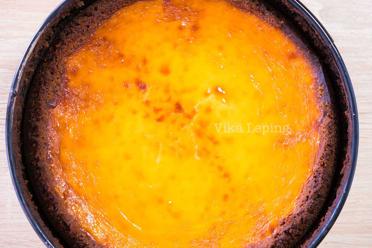 Чизкейк готов, когда края уже схватились, а серединка продолжает дрожжать. После приготовления выключаю духовку, приоткрываю дверцу и оставляю чизкейк внутри еще на час-полтора — он будет доходить, и при этом остывание будет плавным. Чизкейк не растрескается и будет идеально нежным.