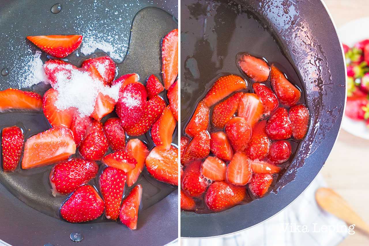 Клубнику разрезаем напополам или на четвертинки, кладем в разогретый сотейник или сковородку, добавляем сахар или фруктозу, крахмал, капельку воды и тушим секунд 40. Все! Клубничный соус к Чизкейку готов!