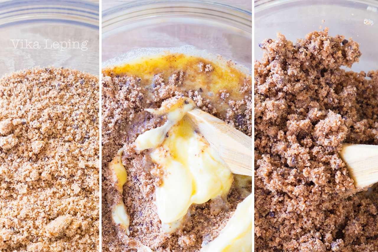 Вливаю в крошку растопленное сливочное масло и смешиваю массу. Она должна напоминать мокрый песок, а если сжать крошку в руке, комочек будет держаться.