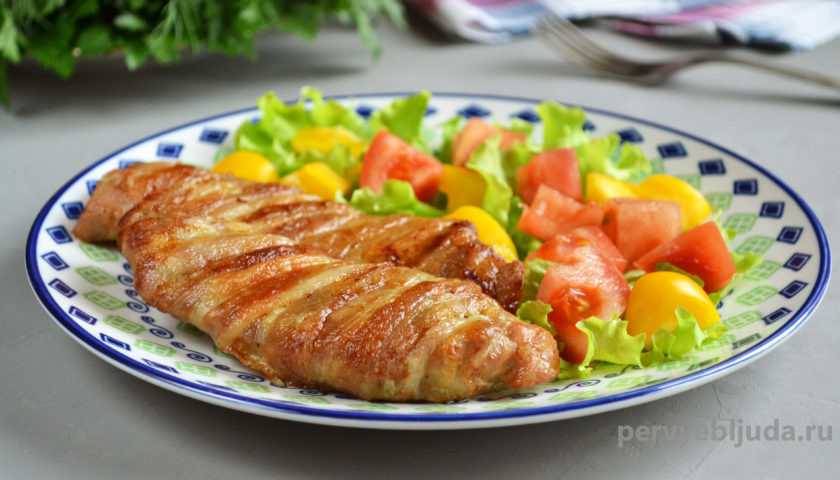 9. Вкуснейшее ароматное филе в беконе вынимаем, сразу перекладываем на тарелку с овощным салатом или просто нарезанными овощами и подаем с горячим гарниром.
