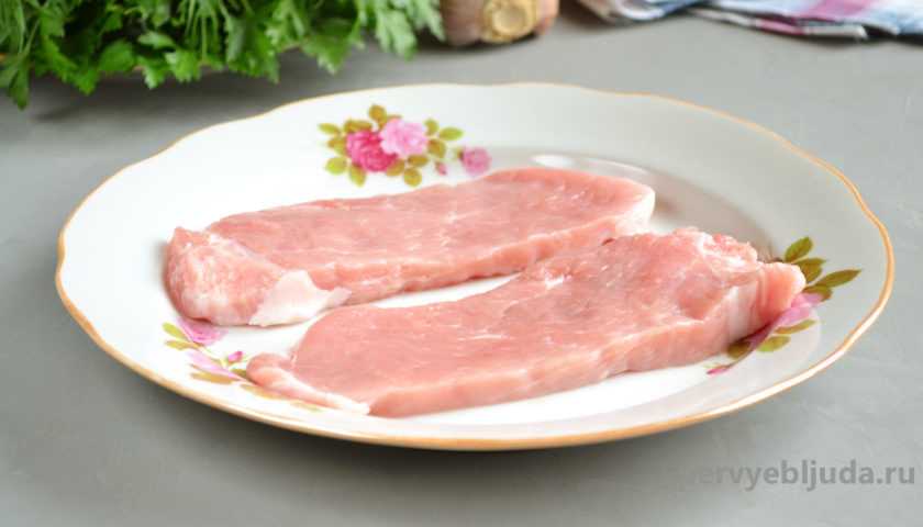 1. Для приготовления блюда покупаем нарезанное филе свинины (шницель) или берем средний кусок, от которого отрезаем кусочки по 120-130 грамм. Отлично подойдет шейка, карбонат или вырезка. Шницель промываем и пропитываем бумажным полотенцем.