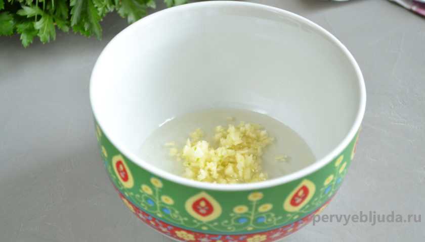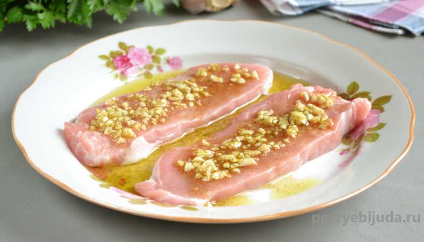 5. Подготовленным ароматным маринадом поливаем куски свинины, переворачиваем их на разные стороны. Чеснок должен располагаться сверху и снизу, накрываем и оставляем на столе на 30-40 минут.