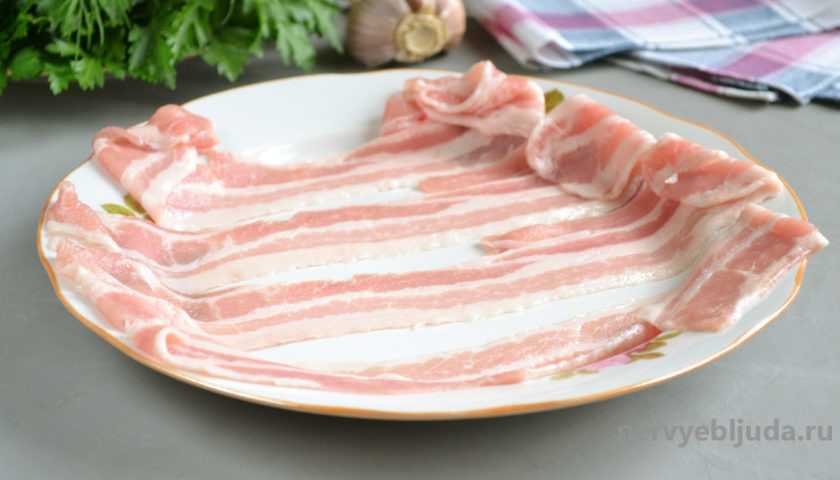 6. Упаковку с беконом открываем, полоски плотно располагаются друг к другу. Отделаем 4 штуки и выкладываем на тарелку или разделочную доску. Удобнее работать с длинными и тонкими полосками бекона.