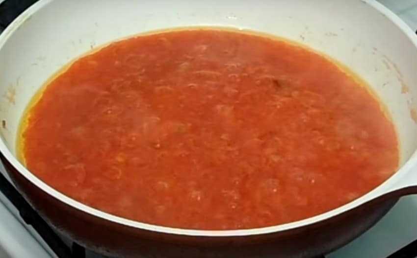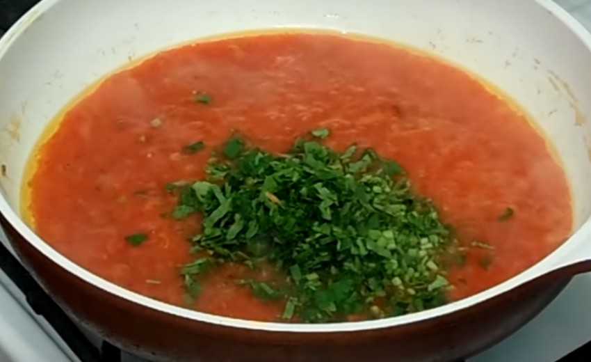 - Далее в горячую сковороду влить воду, перемешанную с томатной пастой. Добавить чеснок, лавровый лист, подходящие специи. Тушить полученную смесь на умеренном огне примерно семь минут. При необходимости можно еще подсолить соус.