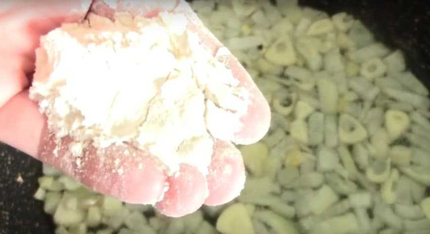 2. Всыпьте муку мелкими порциями, постоянно помешивая. Не прекращая мешать, выдержите на сковороде несколько минут — это придаст готовому соусу слабый ореховый привкус.