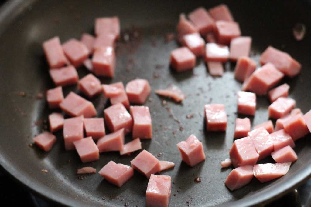 - В сковородке обжариваем ветчину. Используем для этого сливочное масло. Когда ветчина станет румяной и слегка хрустящей, вынимаем ее в отдельную плошку.
