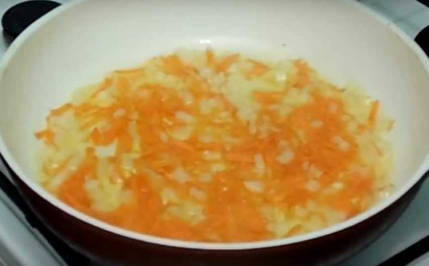 - Вымытые и очищенные лук с морковью измельчить и обжарить в сковороде, где только что жарилось мясо.