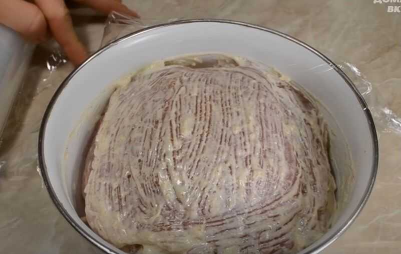 Обмазанные майонезом стейки выложите в глубокую миску, друг на друга. Поверх накройте крышкой или пищевой плёнкой, уберите в холодильную камеру на 12 часов — мариноваться. Лучше все манипуляции провести на ночь, чтобы уже утром можно было приступить к до готовки блюда.
