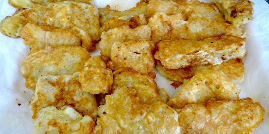 К этому моменту на плите уже должна быть раскалена сковорода с маслом. Выкладываем кусочки жариться.