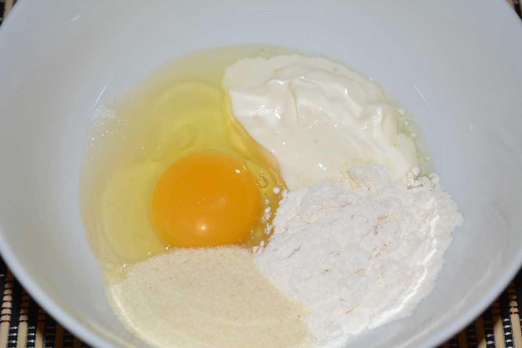 Вбиваем яйцо и добавляем творог, доведенный до однородности. Тщательно перемешиваем.
