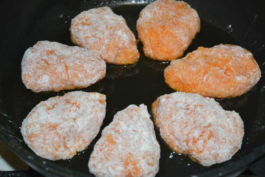 Шаг 3. Формуем из полученной массы морковные котлетки, обваливаем в сухарях и жарим в сковороде с подсолнечным маслом.