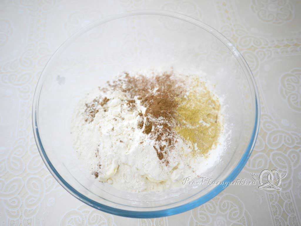 В созданную смесь необходимо всыпать заранее просеянную муку (850 г) и 1 ч. л. соды (без горки). Также на данном этапе в него следует отправить молотые пряности: по чайной ложке имбиря и корицы, а также ложку смеси, сделанной из равных частей черного перца, гвоздики и мускатного ореха. Все соединенные ингредиенты надо перемешать до получения однородной массы, а затем, расфасовав по чистым полиэтиленовым пакетам, убрать в холодильник на ночь.