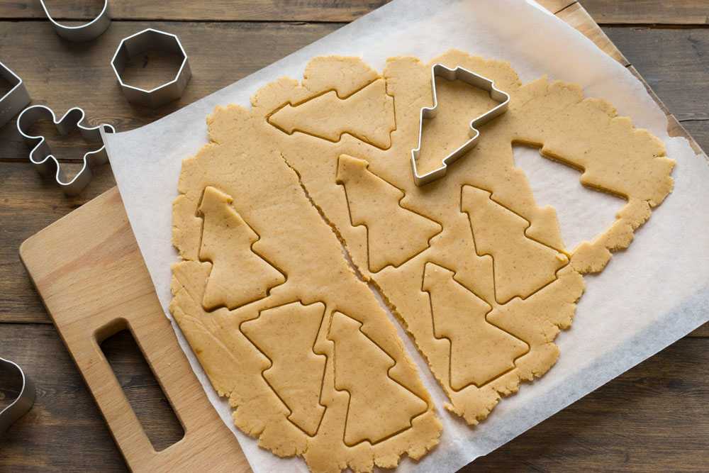 10. Потом застелите стол пергаментной бумагой. Уложите на нее охлажденное тесто и раскатайте его в лепешку толщиной около 5 мм. Приложите к нему фигурку оленя и нажмите на нее. У вас получилось будущее лакомство. Приложите форму на оставшееся тесто и перенесите заготовки на противень с пекарской бумагой.