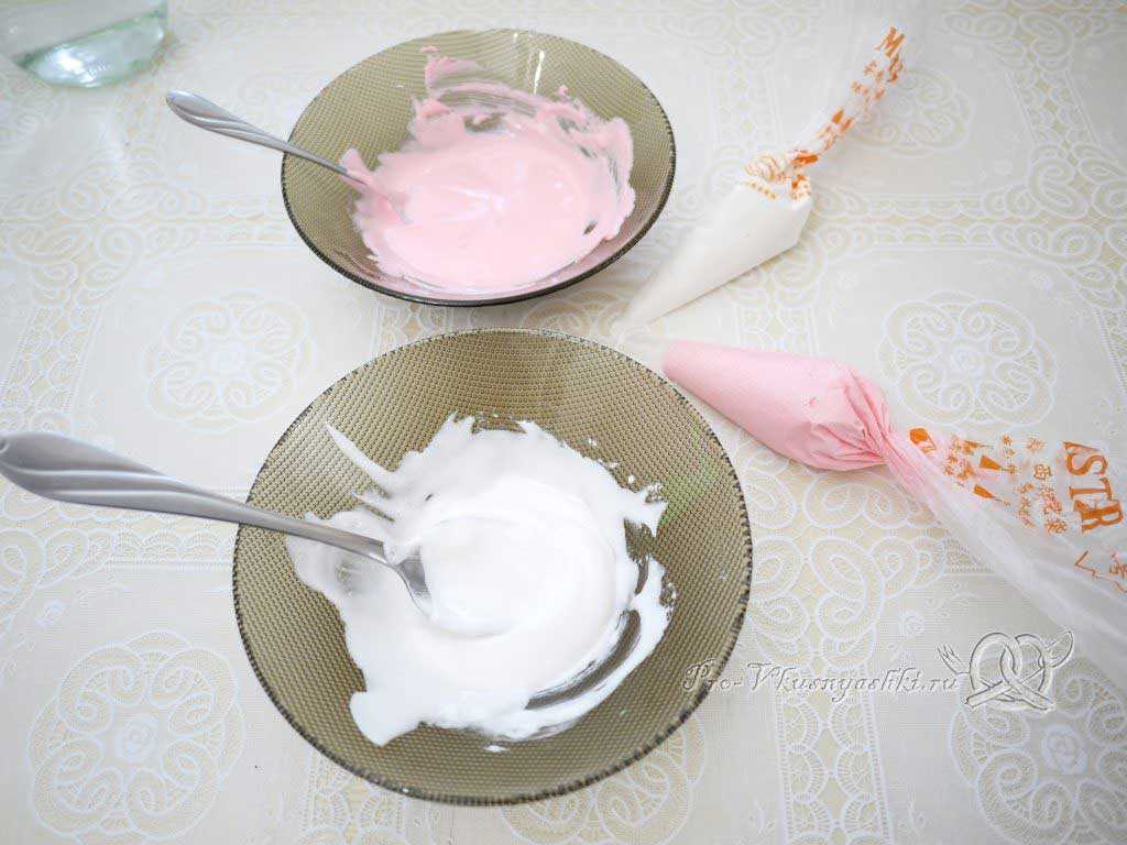 У меня будут пряники двух цветов: розового и белого, поэтому глазурь разделена на две части. Одну оставлю без изменений, она и так белого цвета. Во второю миску необходимо добавить каплю красителя (у меня гелиевый), и хорошо размешать массу до однородного цвета.