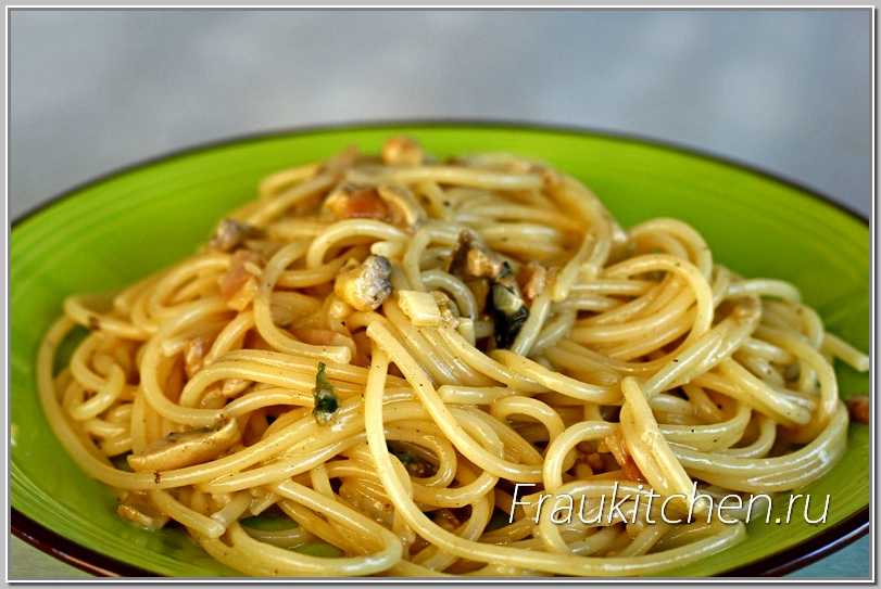 Этот рецепт далек от классики, но от того не менее вкусен. Не характерные для классического рецепта грибы становятся прекрасным дополнениям бекону и сливочному соусу, а сухое белое вино добавляет вкусу многогранности.