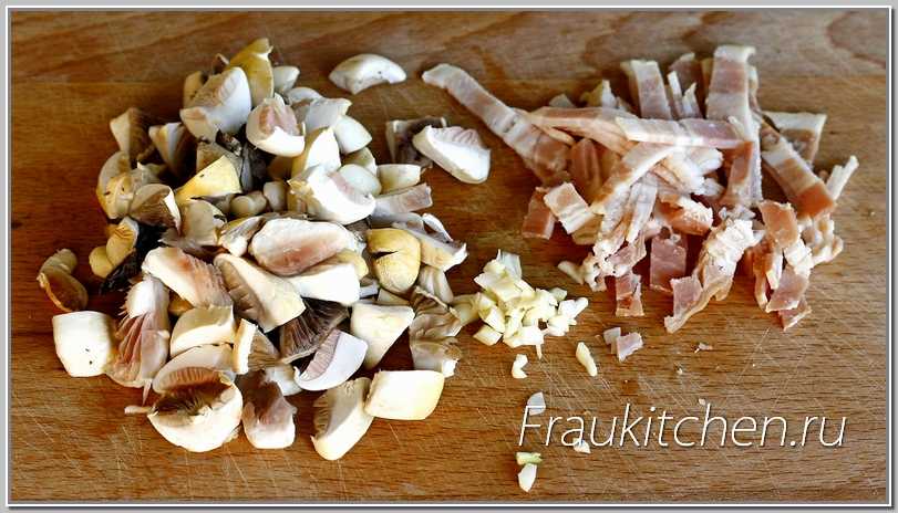 Ставлю сковороду на небольшой огонь и сразу добавляю бекон. Не ужариваю. А довожу до прозрачного состояния жирка. Добавляю шампиньоны и измельченный чеснок. Продолжаю готовить до мягкости грибов еще пару минут.
