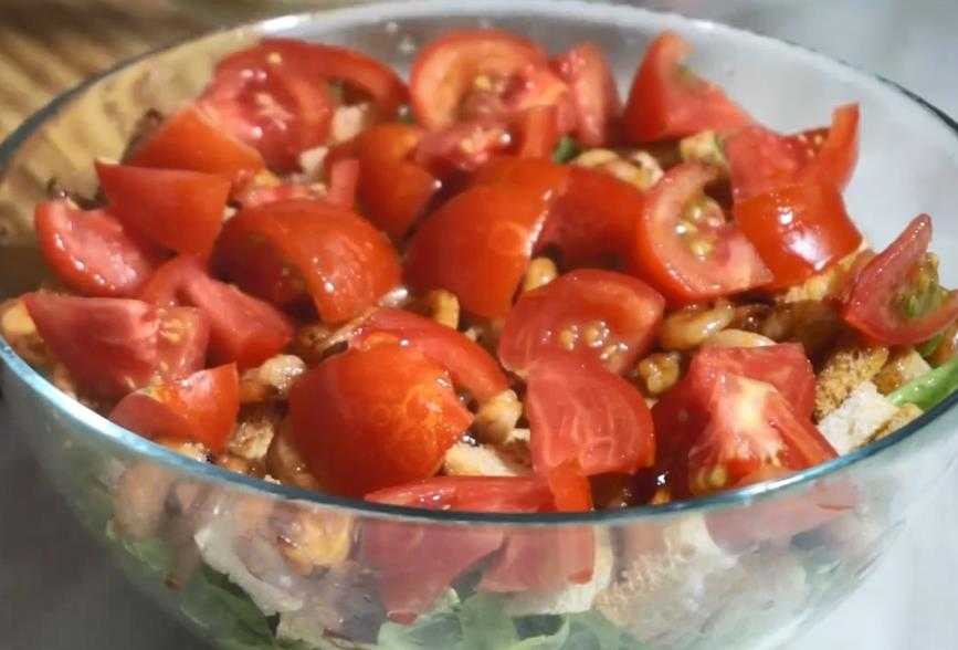 Очень простой в приготовлении салат, который прекрасно подойдет как на праздничный стол, так и на семейный ужин. Не отягощен лишними калориями, поэтому легко воспринимается желудком. В качестве заправки соус Цезарь, который можно купить в магазине. Он слегка острый на вкус, с легким ароматом чеснока и сыром Пармезан в составе.