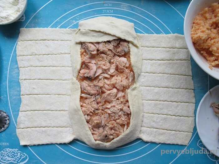 Одну половинку теста пока откладываем в сторону, прикрыв полотенцем. Вторую раскатываем в тонкий пласт до 2 мм. толщиной. Визуально делим его на равные три части. Две боковые из них разрезаем на продольные полосы шириной около 2 см. По центру выкладываем рисовую начинку, а на нее кусочки консервированной рыбы (их слегка разминаем пальцами). Две верхние полосы загибаем по бокам вниз, а две нижние, наоборот, кверху. Таким образом мы «очертили» границы начинки. (ф. 8, 9)
